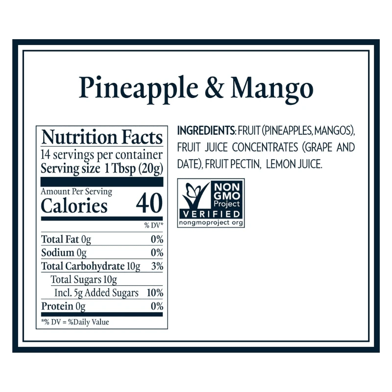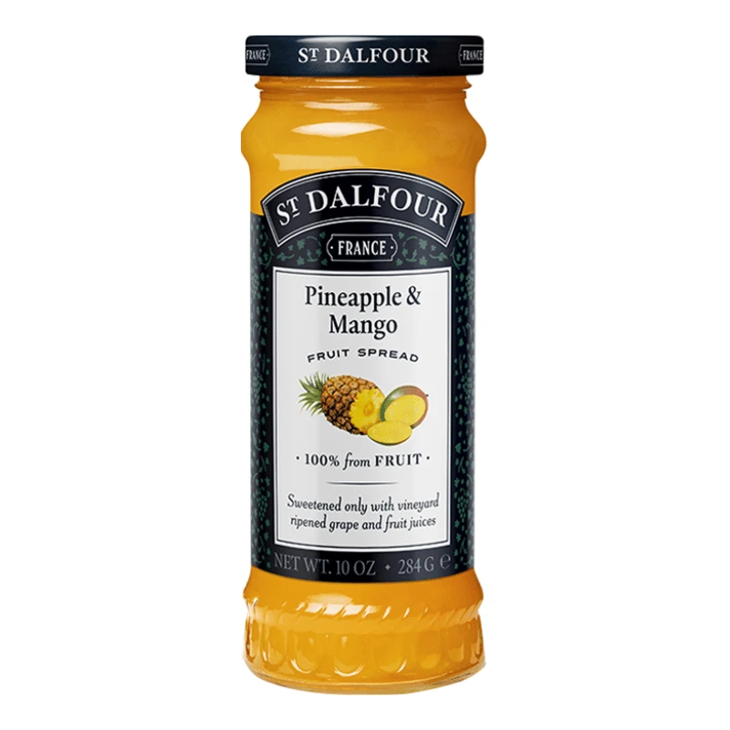 St Dalfour Pineapple & Mango Fruit Spread is a sweet jam made entirely from fruit-based ingredients. The flavors of mango and pineapple pair well with both sweet and savory dishes.
