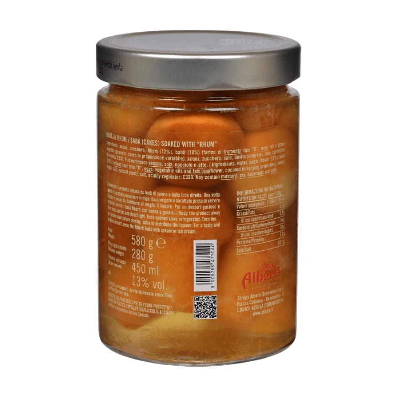 water, sugar, rum (12%), babà (9%) (type “0” wheat flour, eggs, vegetable oils and fats (sunflower, coconut in variable proportions), water, sugar, salt, natural yeast) , salt, acidity regulator: E330.May contain mustard , soy , hazelnuts and milk .