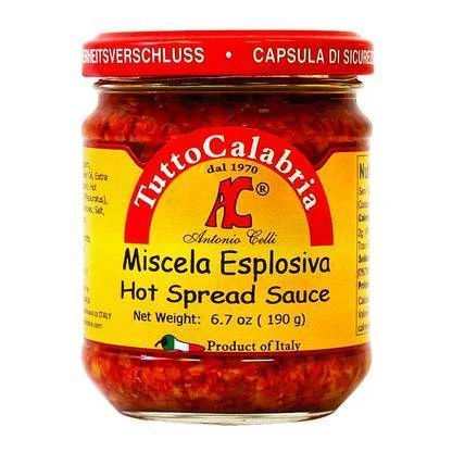 The Italian region of Calabria is famous for its hot peppers and spicy cuisine. Tutto Calabria Miscela Esplosiva Hot Spread is an Italian spread that is excellent on pasta, pizza, toast, and more. This robust pepper spread is made with herbs, vinegar, eggplant, mushrooms, dried tomatoes, artichokes, carrots, extra virgin olive oil, and salt.