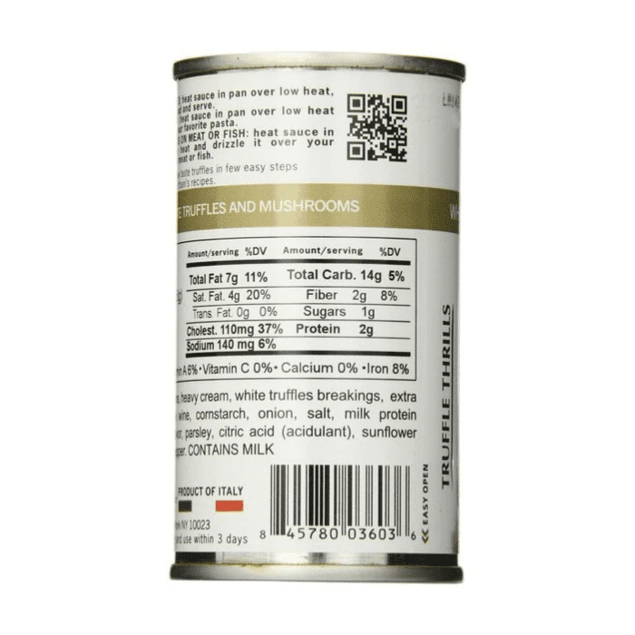 Mushrooms, heavy cream, white truffles breakings, extra virgin oil, white wine, cornstarch, onion, salt, milk protein concentrate, truffle flavor, parsley, citric acid (acidulant), sunflower lecithin (emulsifier), pepper. Contains milk.