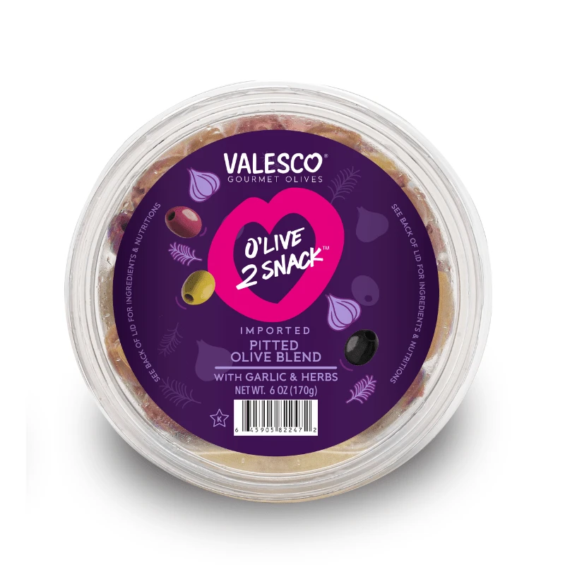 Valesco Garlic and Herbs Pitted Olives use only the highest quality olives, sourced from all over the Mediterranean region. A higher quality snack than what you’ll find at most grocery stores, this mix of green and black olives contains a savory garlic flavor and aromatic herbs. They are perfect for snacking, charcuterie platters, or adding to a pasta salad. Serve these marinated olives at room temperature and enjoy with wine, sweet cider, or even a refreshing glass of fruit juice.