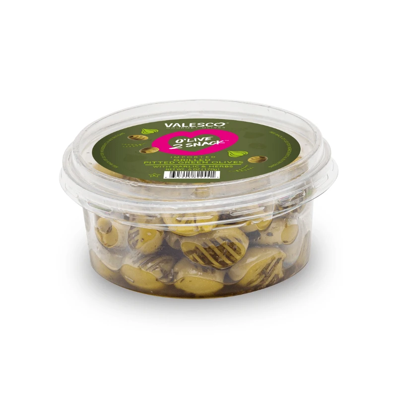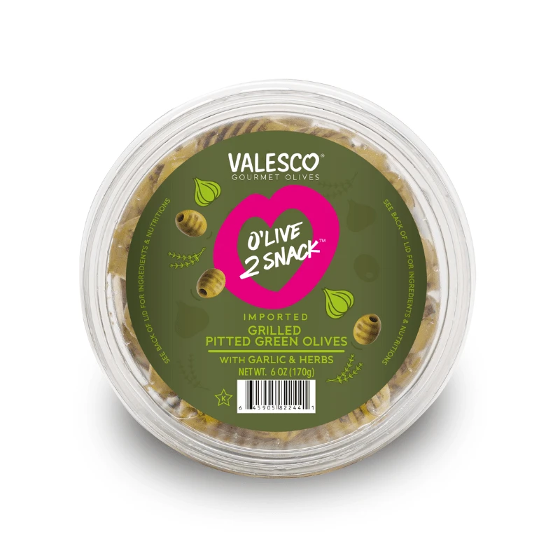 Valesco Grilled and Marinated Pitted Olives use only the highest quality types of olive, sourced from all over the Mediterranean region. These medium pitted green olives have been soaked in savory garlic and herb flavor and grilled for a smoky finish. With appetizing grill marks, they are perfect for on-the-go snacking and charcuterie boards. Enjoy with wine, sweet cider, or even a refreshing glass of fruit juice.