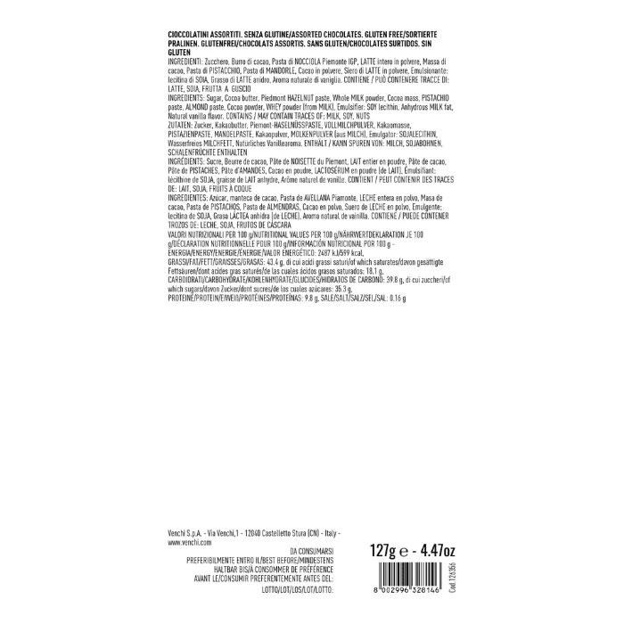 Sugar, Cocoa butter, Piedmont HAZELNUT paste, Whole MILK powder, Cocoa mass, PISTACHIO paste, ALMOND paste, Cocoa powder, WHEY powder (from MILK), Emulsifier: SOY lecithin, Anhydrous MILK fat, Natural vanilla flavor.