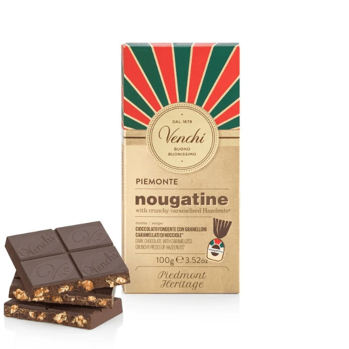 Venchi’s Nougatine Bar is a classic Italian nougat coated in rich chocolate. This delicious Chocolate bar has crunchy pieces of caramelized Piedmont Hazelnut coated in dark chocolate.
