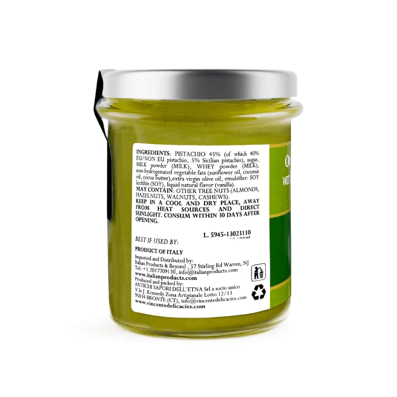 Pistachio (minimum 45%), sugar, milk powder, whey powder, non-hydrogenated vegetable fats (sunflower oil, coconut oil, cocoa butter), extra virgin olive oil, soya lecithin, vanilla flavoring.