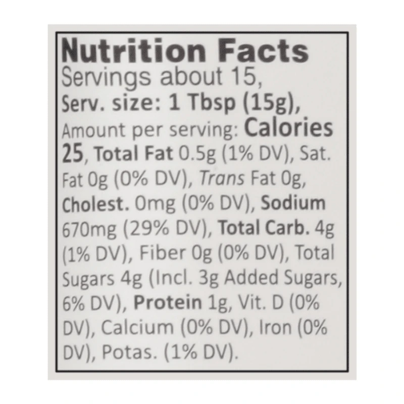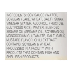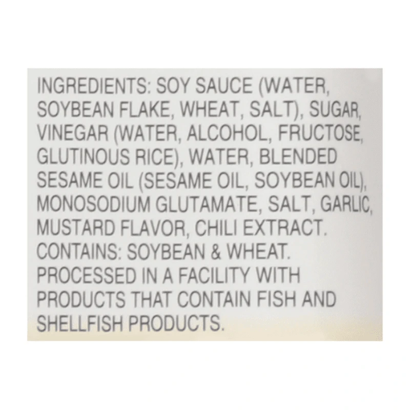 Soy Sauce (water, Soybean, Wheat, Salt), Sugar, Vinegar (water, High Acid Vinegar(12% Acidity), Alcohol) Water, Blended Sesame Oil (soybean Oil, Sesame Oil), Monosodium Glutamate, Garlic, Salt, Mustard Extract, Chili Extract